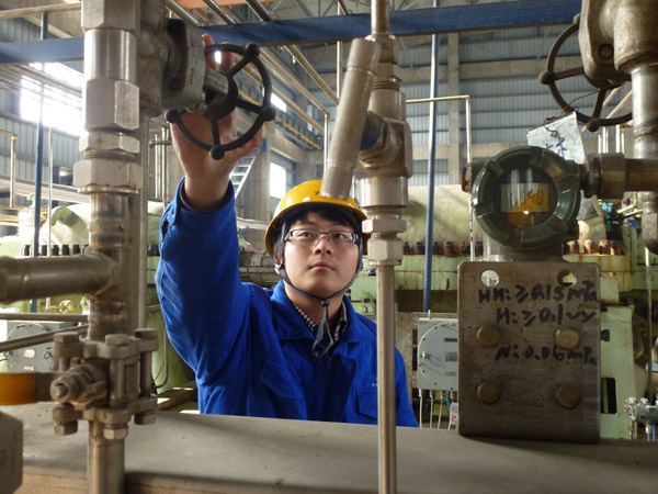 图为合成工段操作人员正按工艺要求调节阀门。