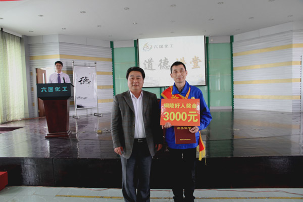 市人大副主任崔玉奇为“铜陵好人”王忠颁发证书、奖章、奖金,永利yl23411集团公司常务副总经理姜华为王忠颁发“铜陵好人”配套奖。为鼓励更多人推荐先进人物事迹,弘扬社会正气、传递正能量,市文明办副主任江虹为永利yl23411集团公司政工部部长蒋世刚颁发了推荐奖。