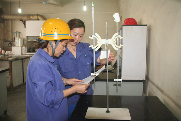 图为该公司检验中心员工将经过铜陵市计量测试研究所检定的酸式滴定管送到磷酸车间化验分析班,并了解该化验分析室实验条件和需求。(陈沐)