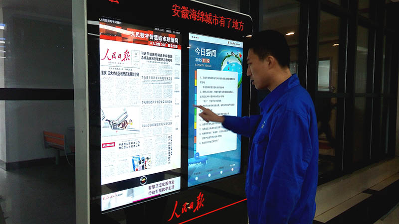 为加强主流舆论阵地建设,铜陵市委宣传部为我市相关企事业单位赠送、安装启用《人民日报》电子阅报栏。该电子阅报栏采用多项专利数字信息技术,集报纸、电视、广播、网络等各类信息传播功能于一体,为该公司员工多渠道、及时了解国内外发生的重大新闻事件及综合信息提供了便捷。具有占地面积小、外观靓丽、更新及时传输速度快、传输容量大、覆盖面广、画面清晰、人屏互动等特点的电子阅报栏,成为了永利yl23411集团公司又一道靓丽的文化风景线。(张红丽)