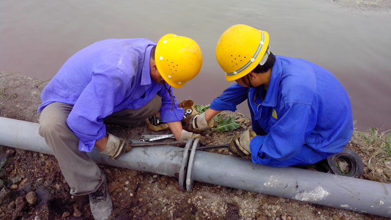 4月29日,小长假第一天,也是他们加班的第一天。当天上午8点40分,维修班的同志们准备好可能用到的工具。9点准备完毕,一场紧迫的改造战斗也随之展开了。大伙被分批送到改造作业现场,供应方也将关键材料——直径为150mm、长2m的PO管送来了18根。每根管子大约重几十公斤,两人扛在肩上很是吃力,加上现场挖掘机将道路切断,人更是难以行走。管子只能分两段铺设:一段是将管子从堆放处滚到淋溶水和排涝沟之间的河堤口;另一段由两人扛在肩上沿着狭窄难行的河堤铺放到位。在第二段管子铺放过程中,车间管理人员带头,大伙干劲十足地将管子逐一铺放到位。中午12点,18根管子全部铺放到位。