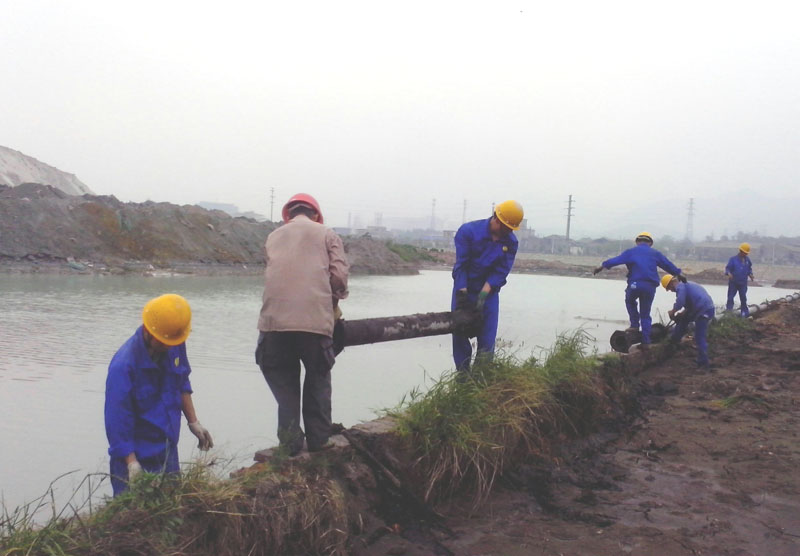 PO管衔接并不像想象的那么容易,有些管子陷入淤泥当中,人根本就不能靠近,他们找来铁锹,抬起一头;另一头陷得比较深,只能找来木头垫子,人踩在上面将其抬起。毕竟是在淤泥上站着,用不上力,他们费了好大劲才将其拉起。就这样,120m长的管道安装完成已经是中午12点30分了。下午又运来20根PO管,他们继续忙碌着一直到很晚。