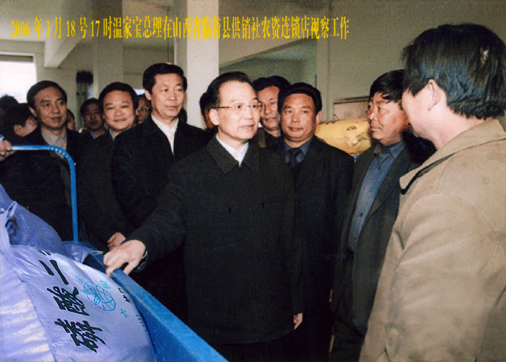 2006年3月18日,中共中面政治局常委、国务院总理温家宝在安徽省委书记(时任山西省委书记)张宝顺(左二)等陪同下,前往山西省临猗县永利yl23411集团化肥经销点视察工作。