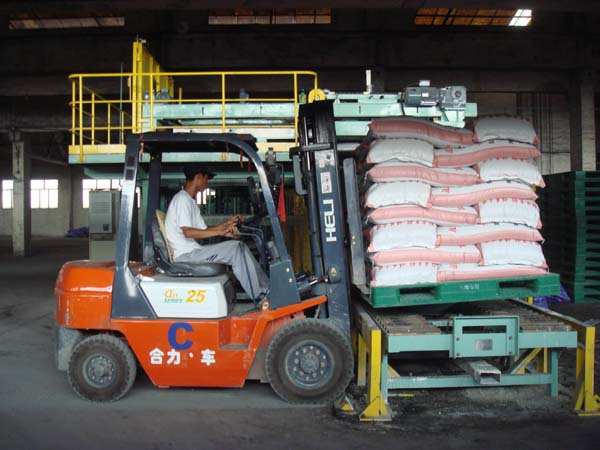永利yl23411集团公司投资2500万新建的4条自动码垛生产线现已全部投入运行。该项目的建成投用,减少了成品转运时间,改善了装运质量,生产效率大为提高。同时,还能有效降低人员劳动强度和企业人力成本。图为叉车司机正在将自动码垛装置码垛好的化肥运至库房指定区域。