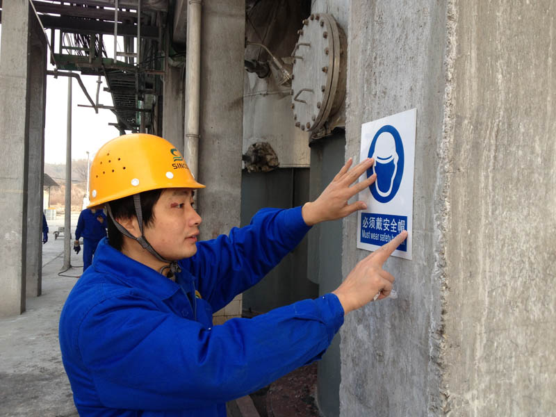 近日,鑫克化工公司对生产和办公区域的安全警示标志牌进行更新,确保所有标志牌清晰醒目,起到良好的提醒和警示效果。图为该公司专职安全员正在装置现场布置新的安全警示标志牌。